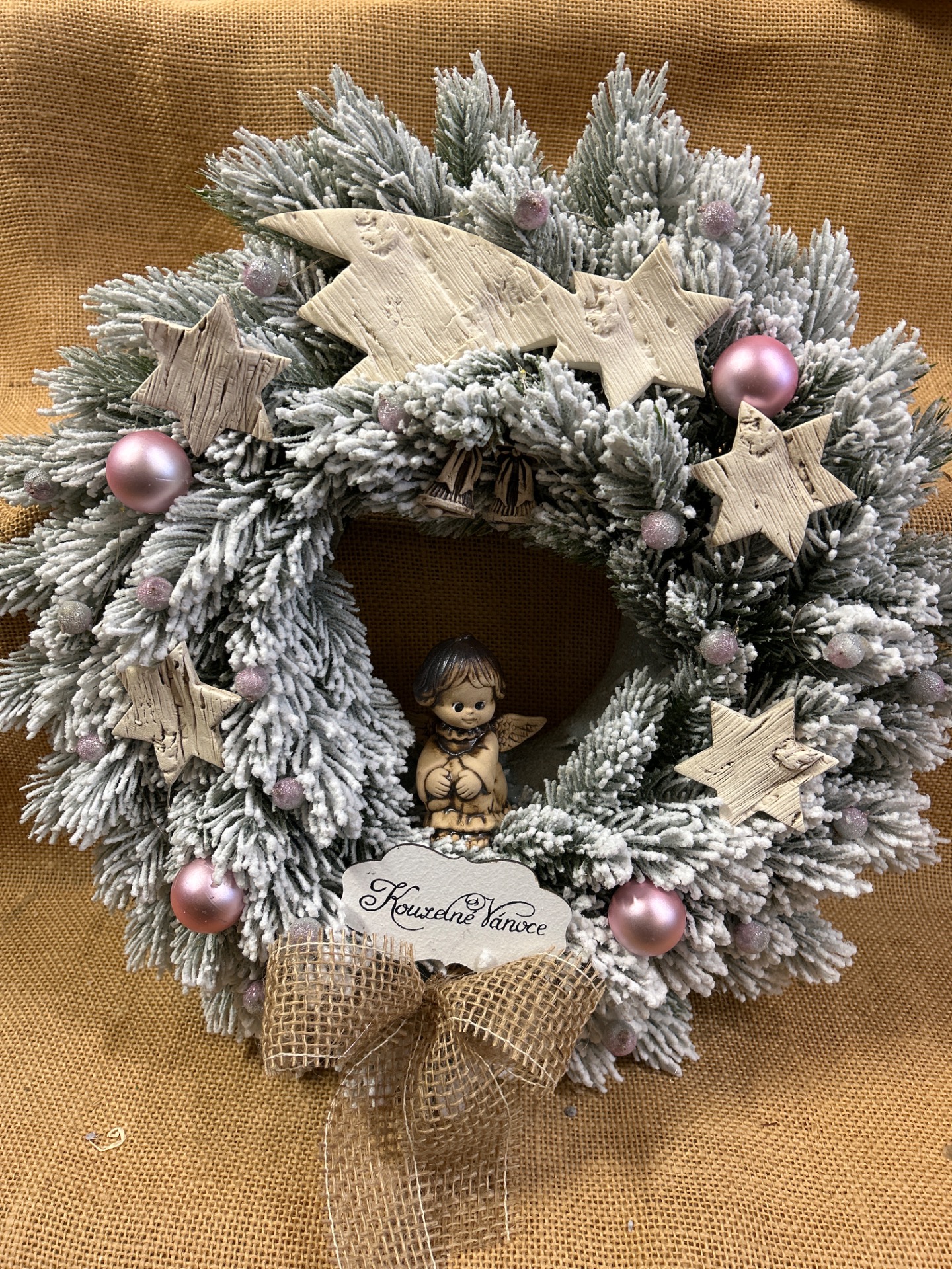 zasněžený osvětlený věnec průmer 40 cm zdobený keramikou