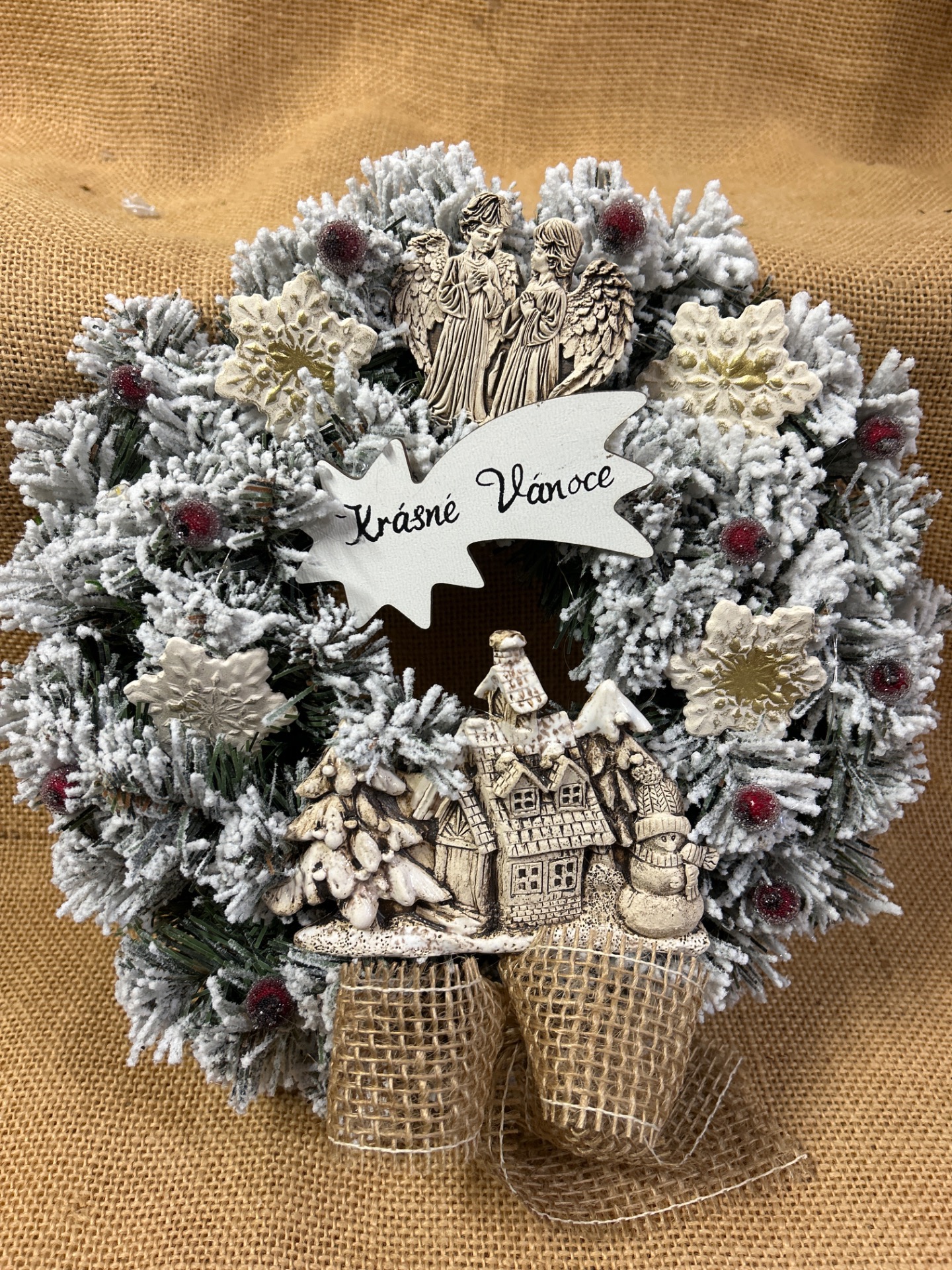 30 cm velký zasněžený věnec bohatě zdobený keramikou prizdobený do tmavě červené barvy
