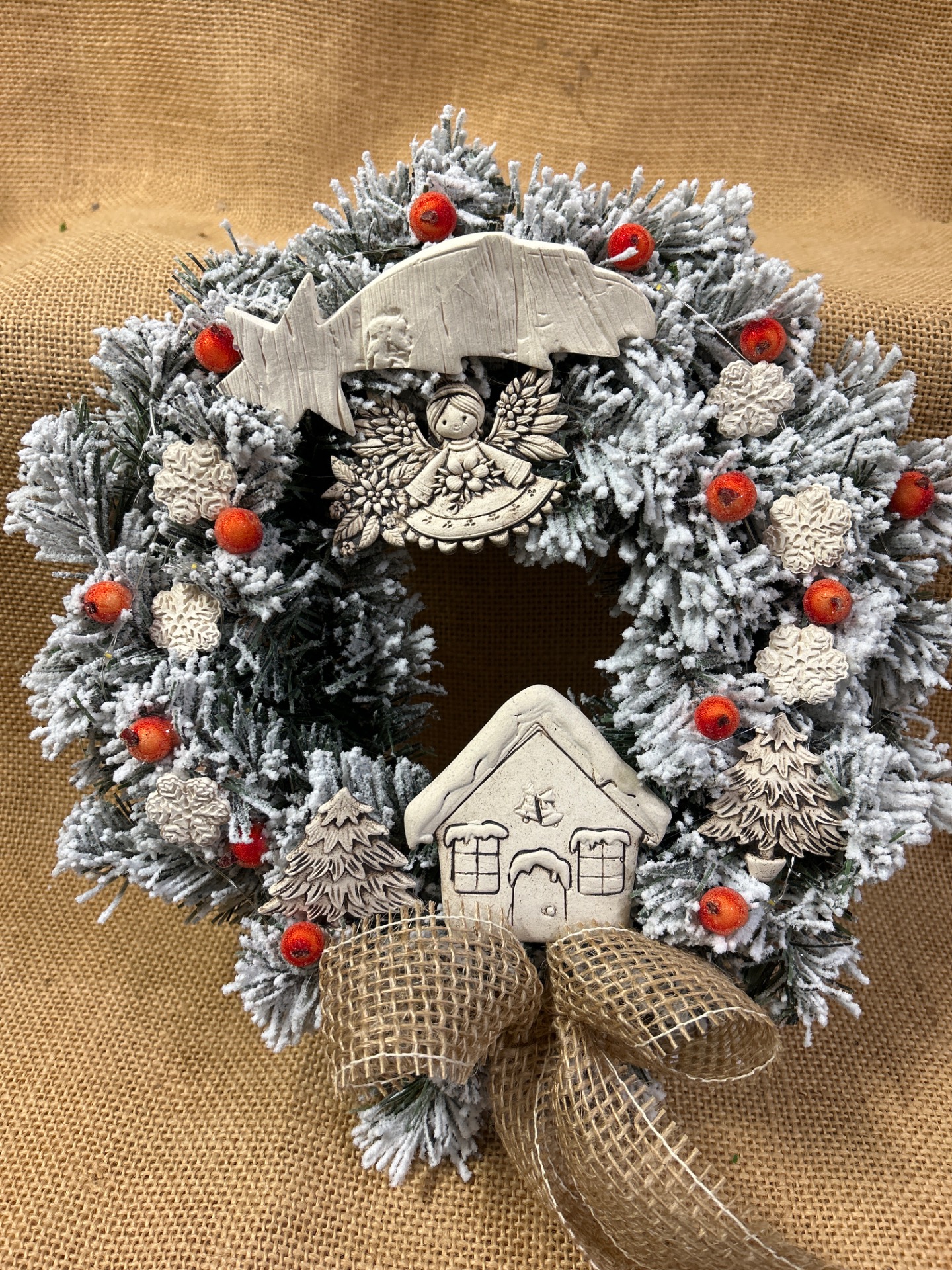 krásný věnec 30 cm zdobený bohatě keramikou přizdobený do oranžové barvy