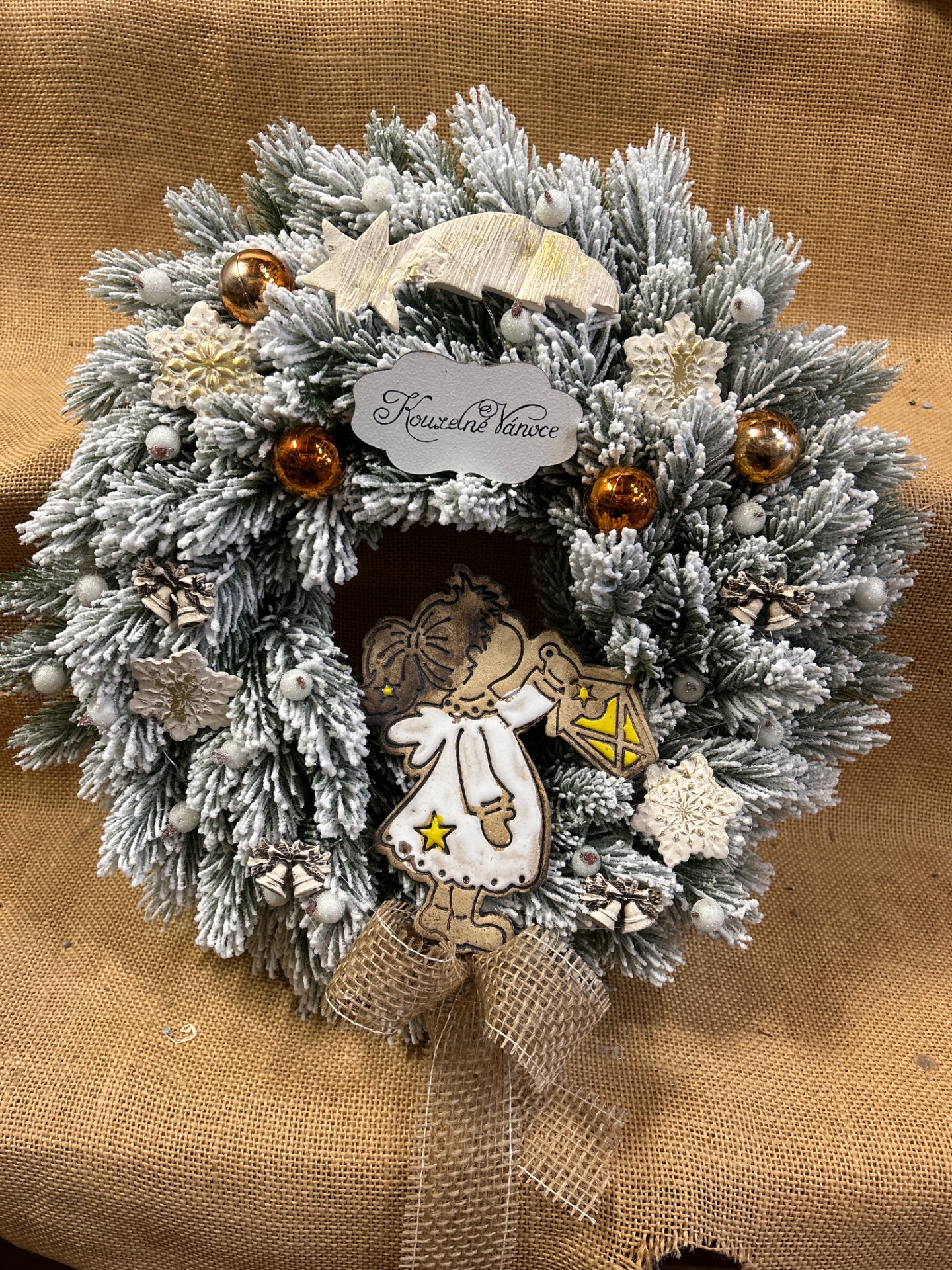 věnec průměr 40 cm bohatě zdobený keramikou osvětlený