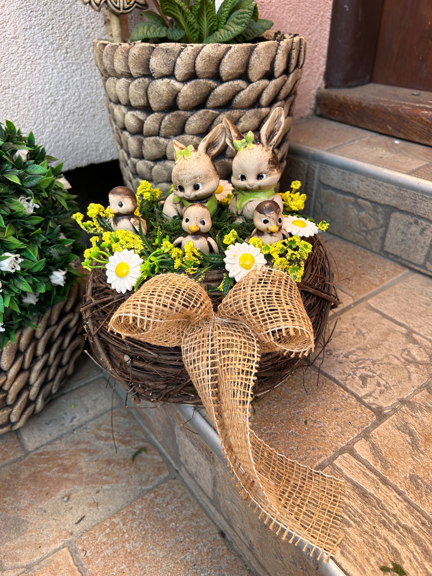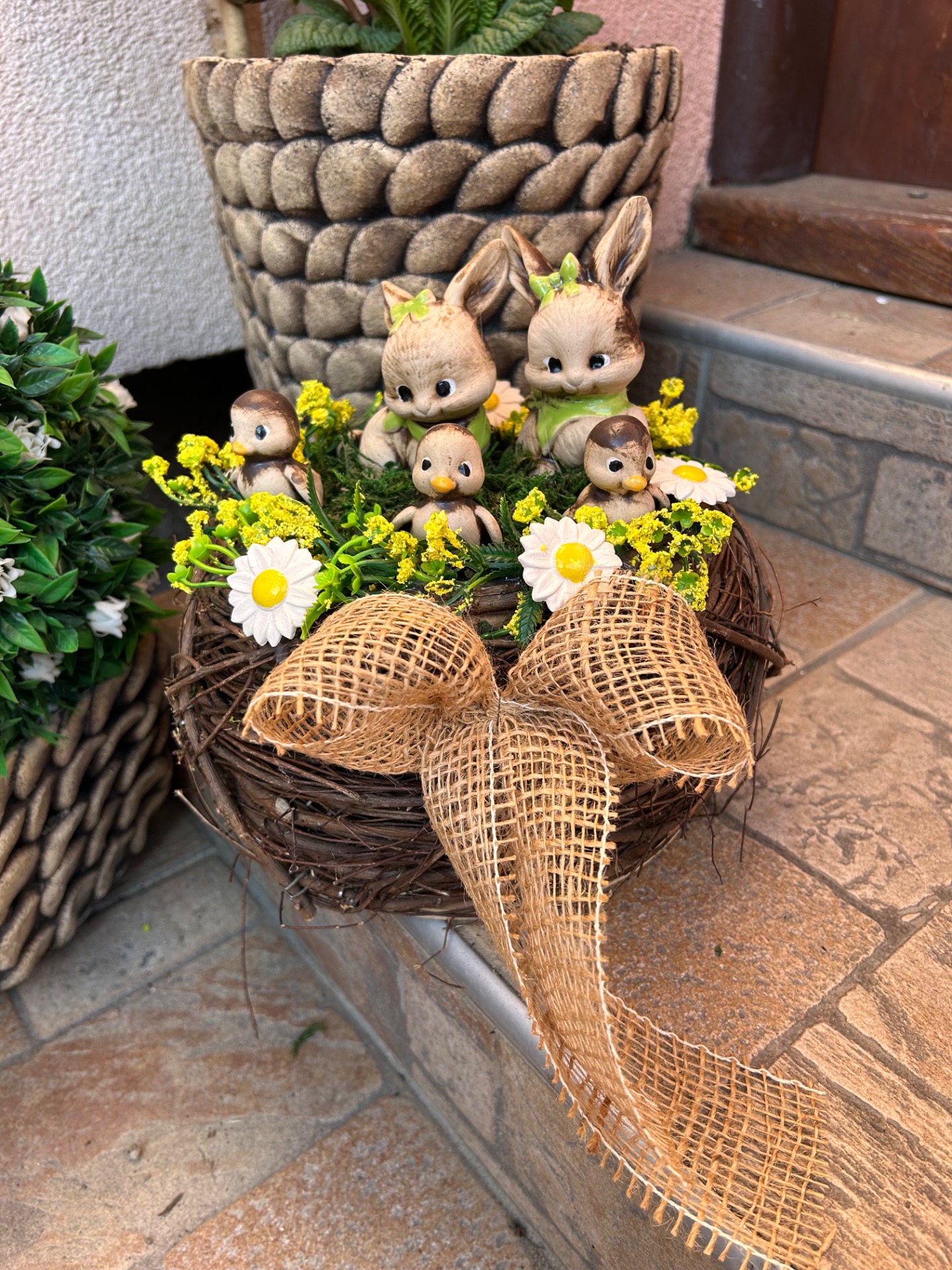 Roztomilé jarní hnízdo s králíčky je krásnou dekorací na stůl, komodu i vstupní prostor. Přírodní proutěný základ je doplněn mechem, keramickými květinami, zvířátky ,které vytvářejí útulnou jarní atmosféru.průměr hnízda 20 cm výška 11cm