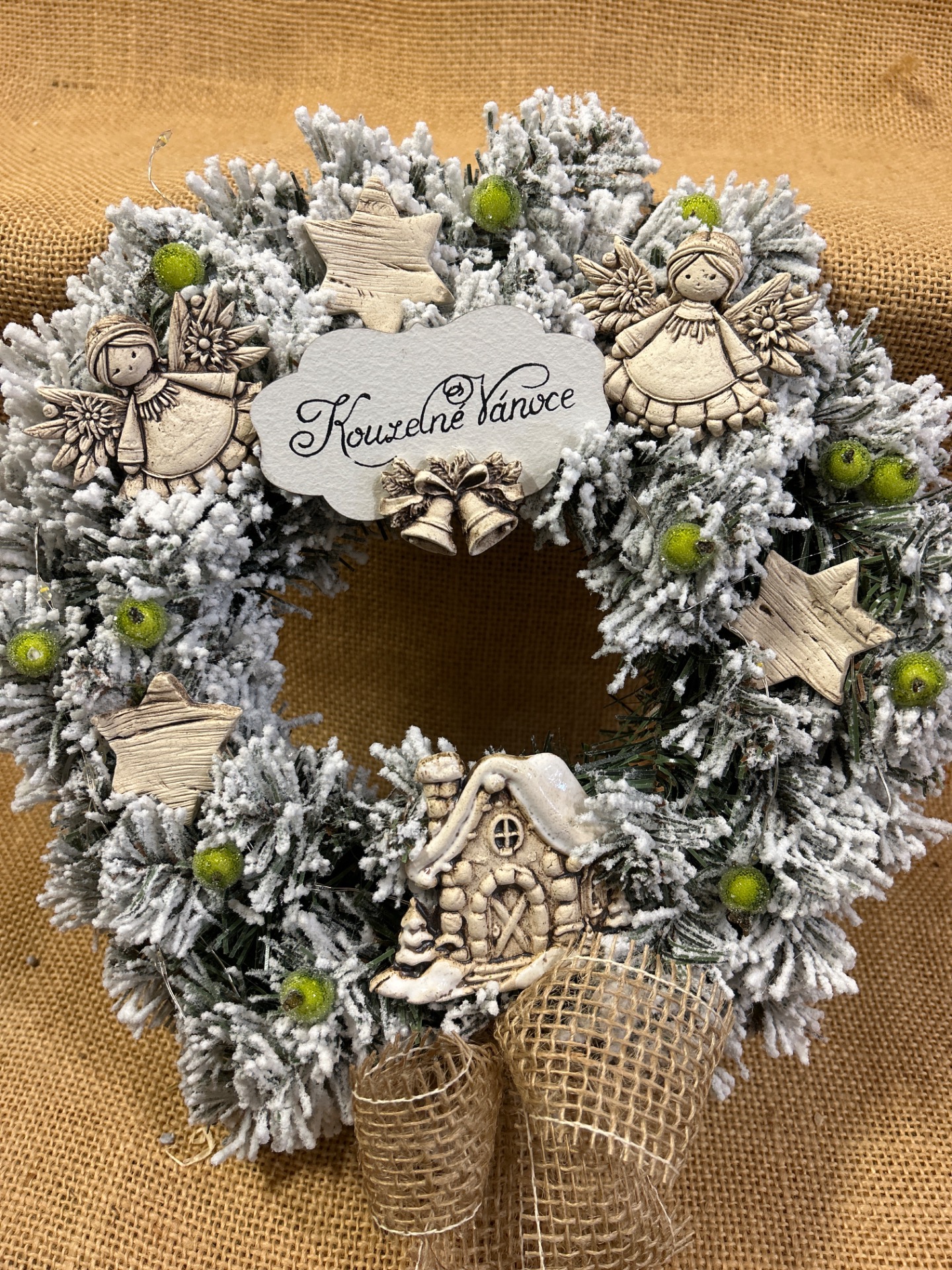 věneček 30 cm osvětlený , bohatě zdobený keramikou přizdobený do zelené barvy s andílky
