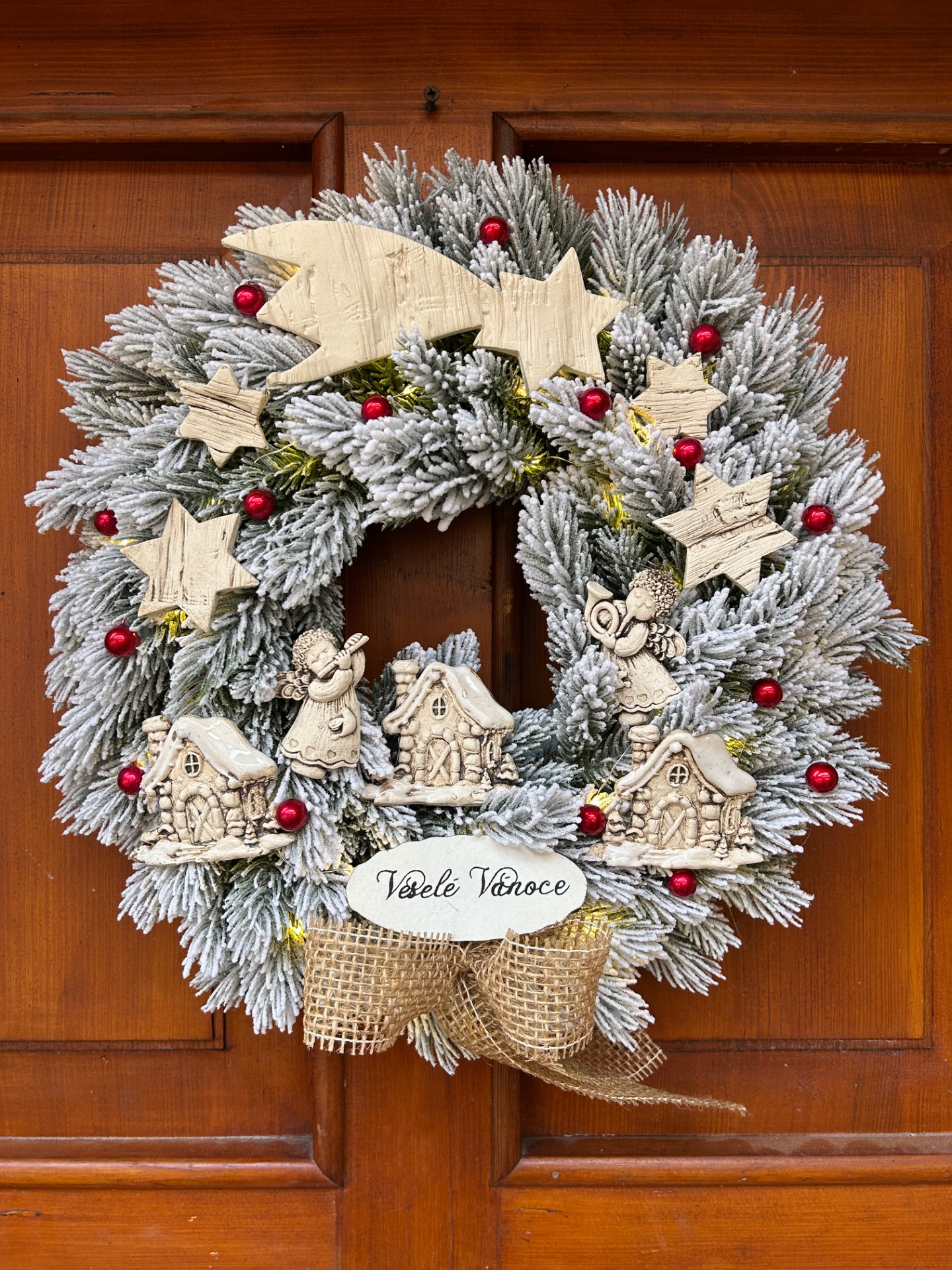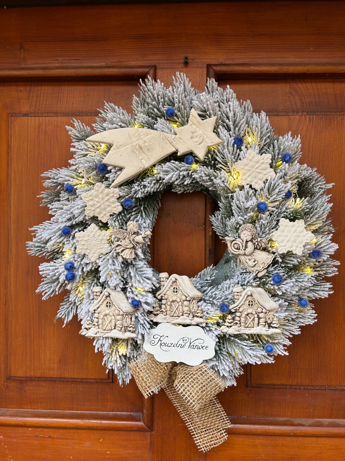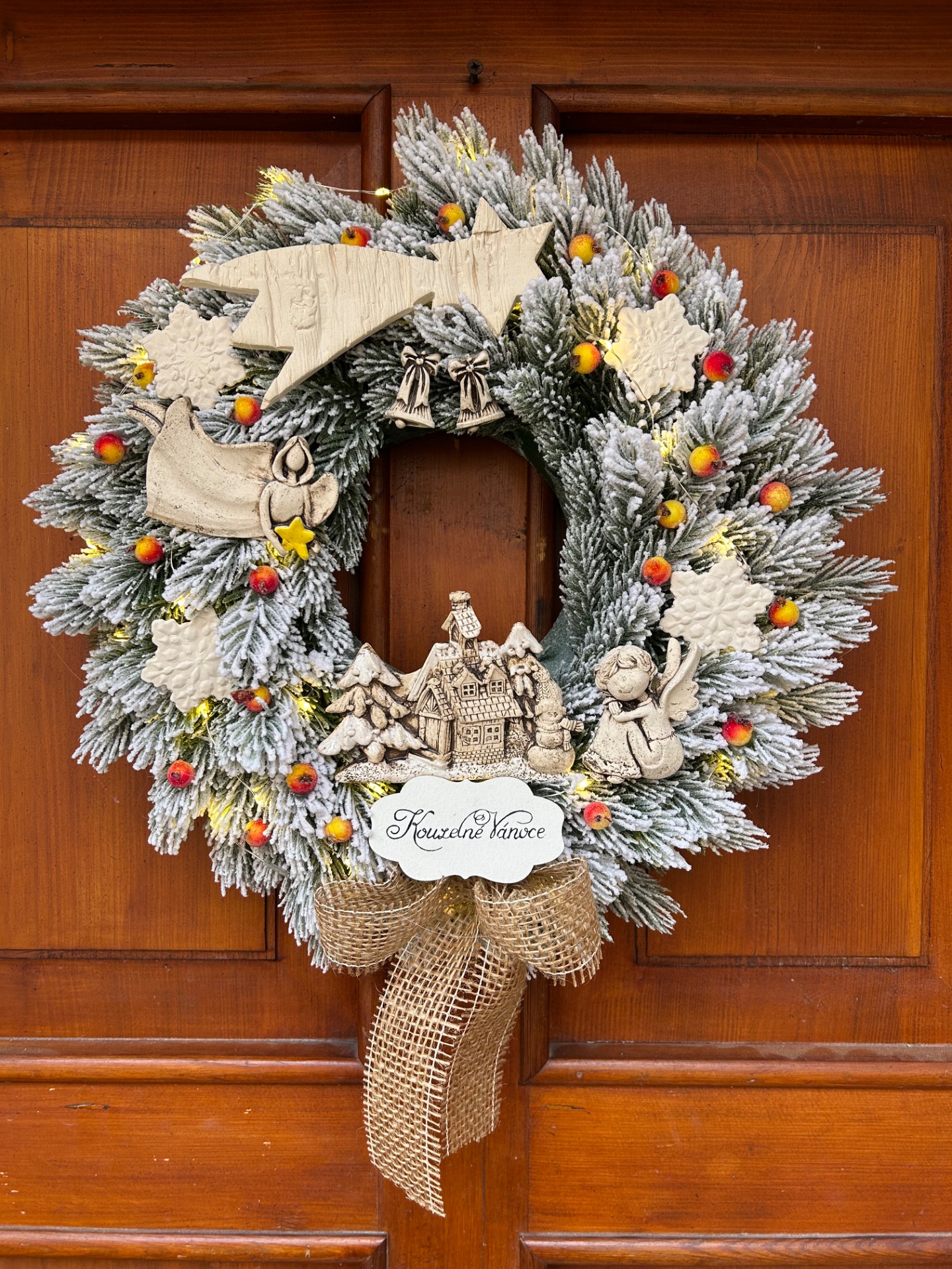 Vánoční osvětlený věnec zdobený do sříbrno červena