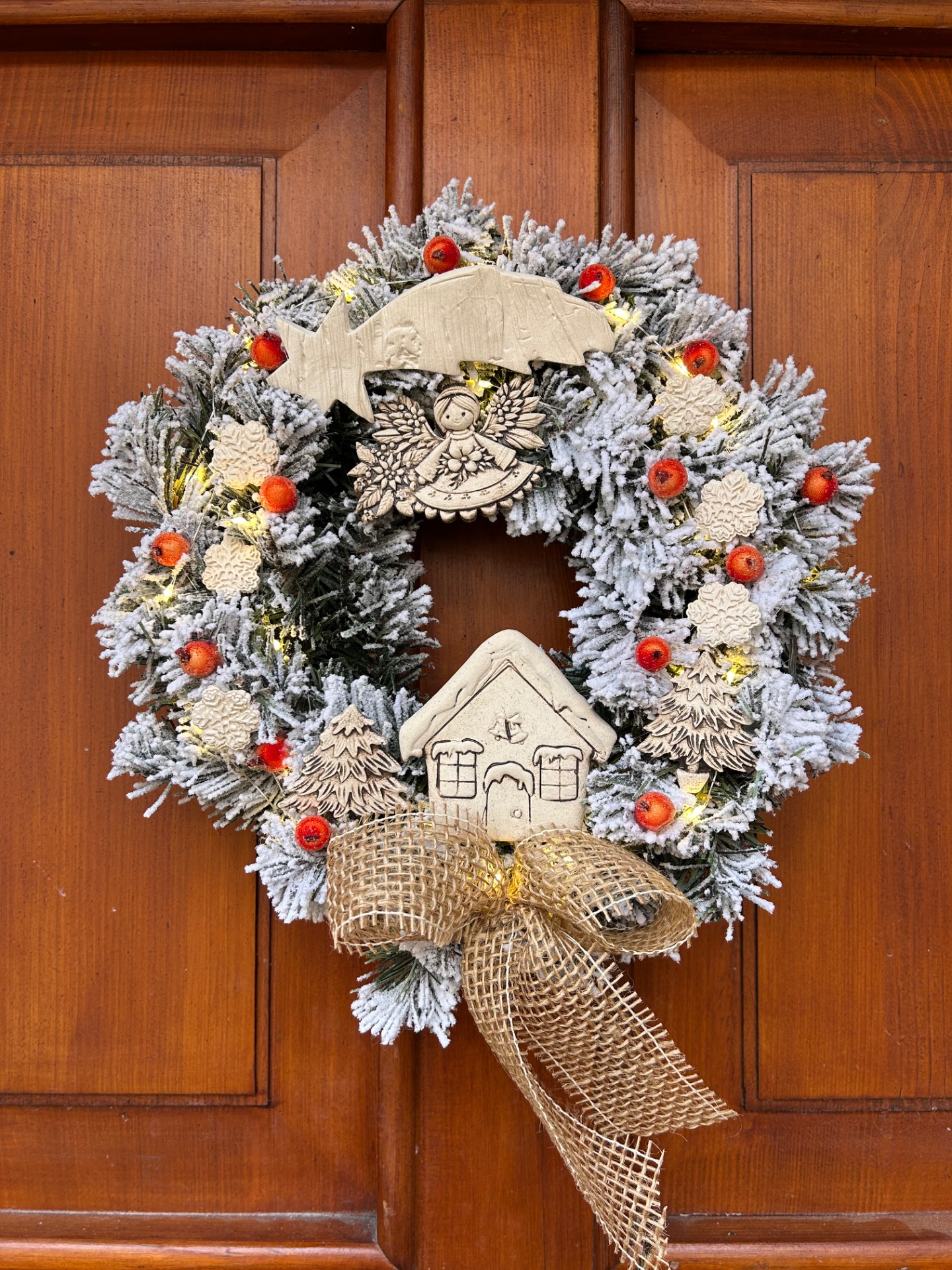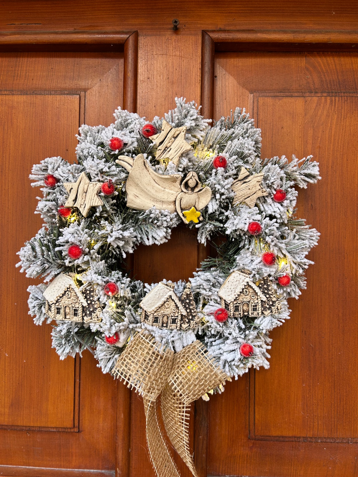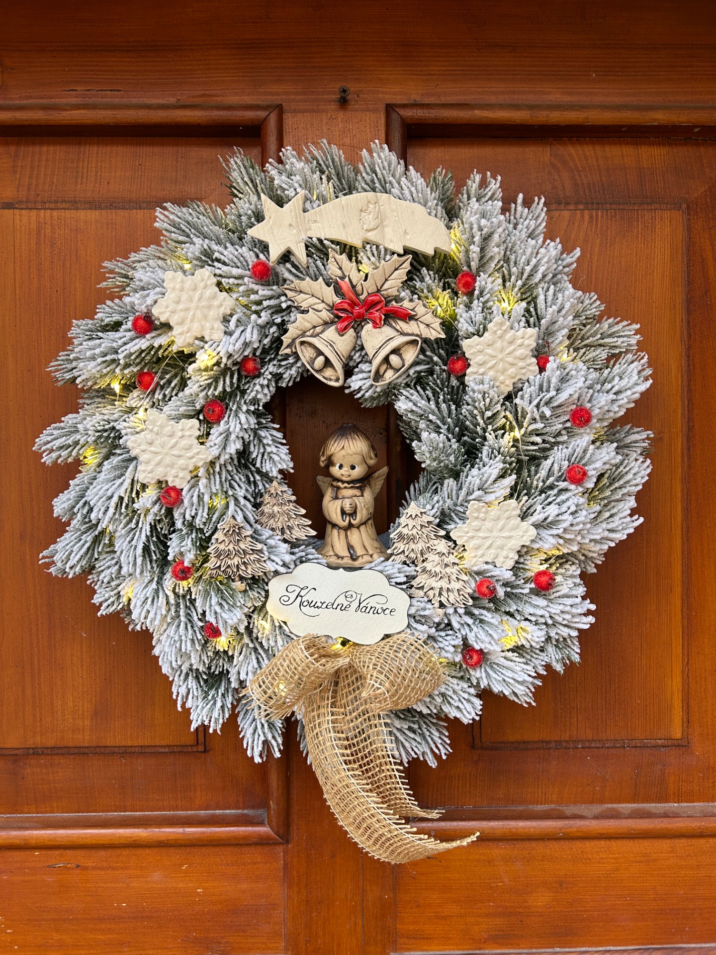 Vánoční osvětlený věnec zdobený do sříbrno červena