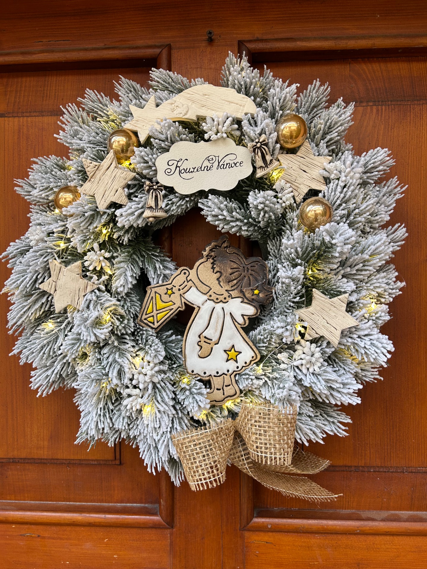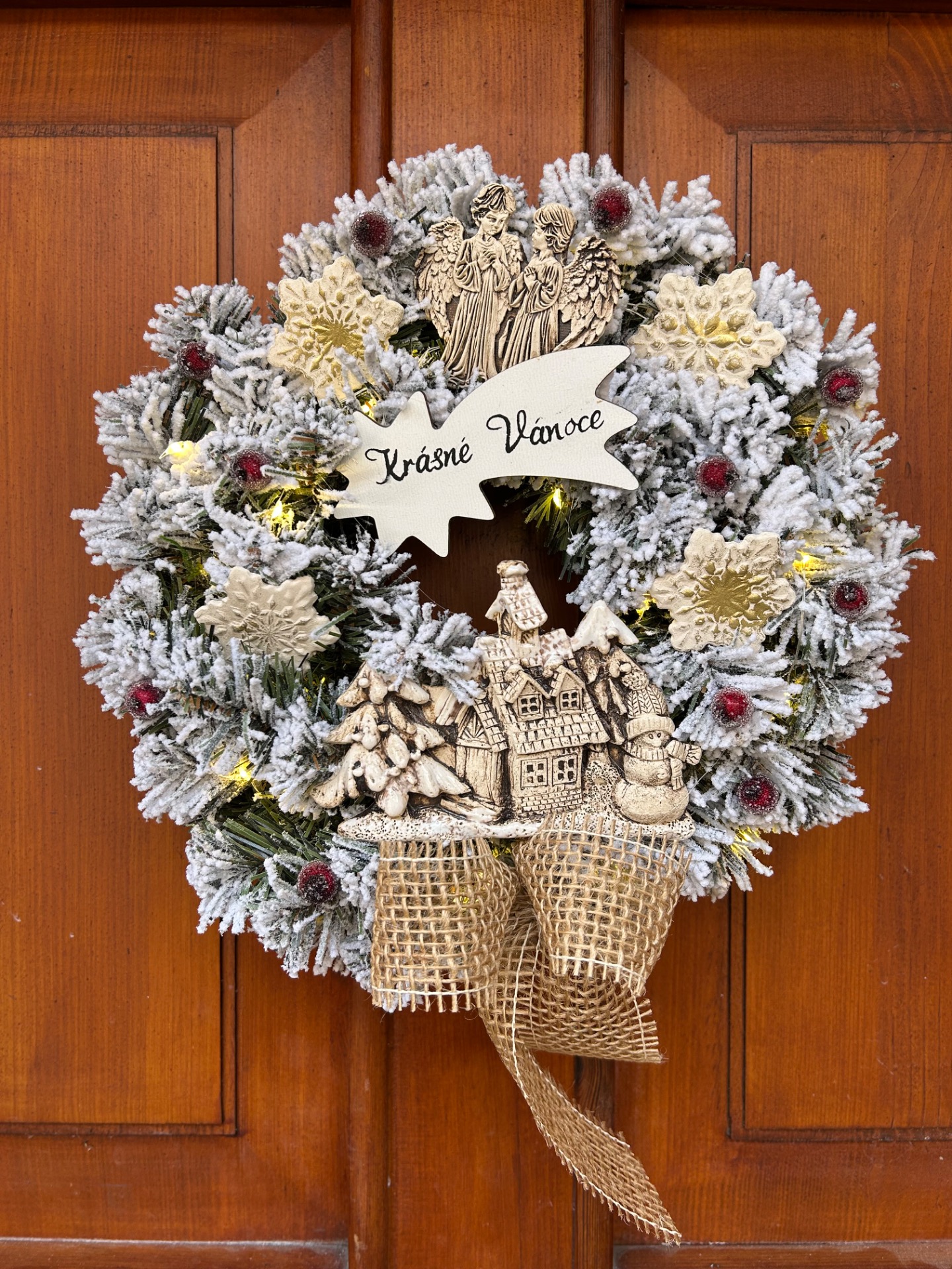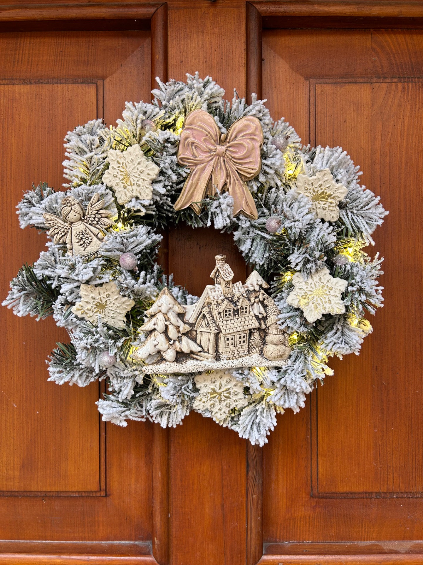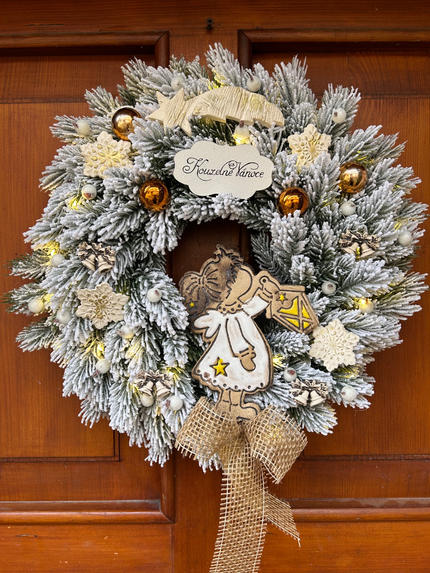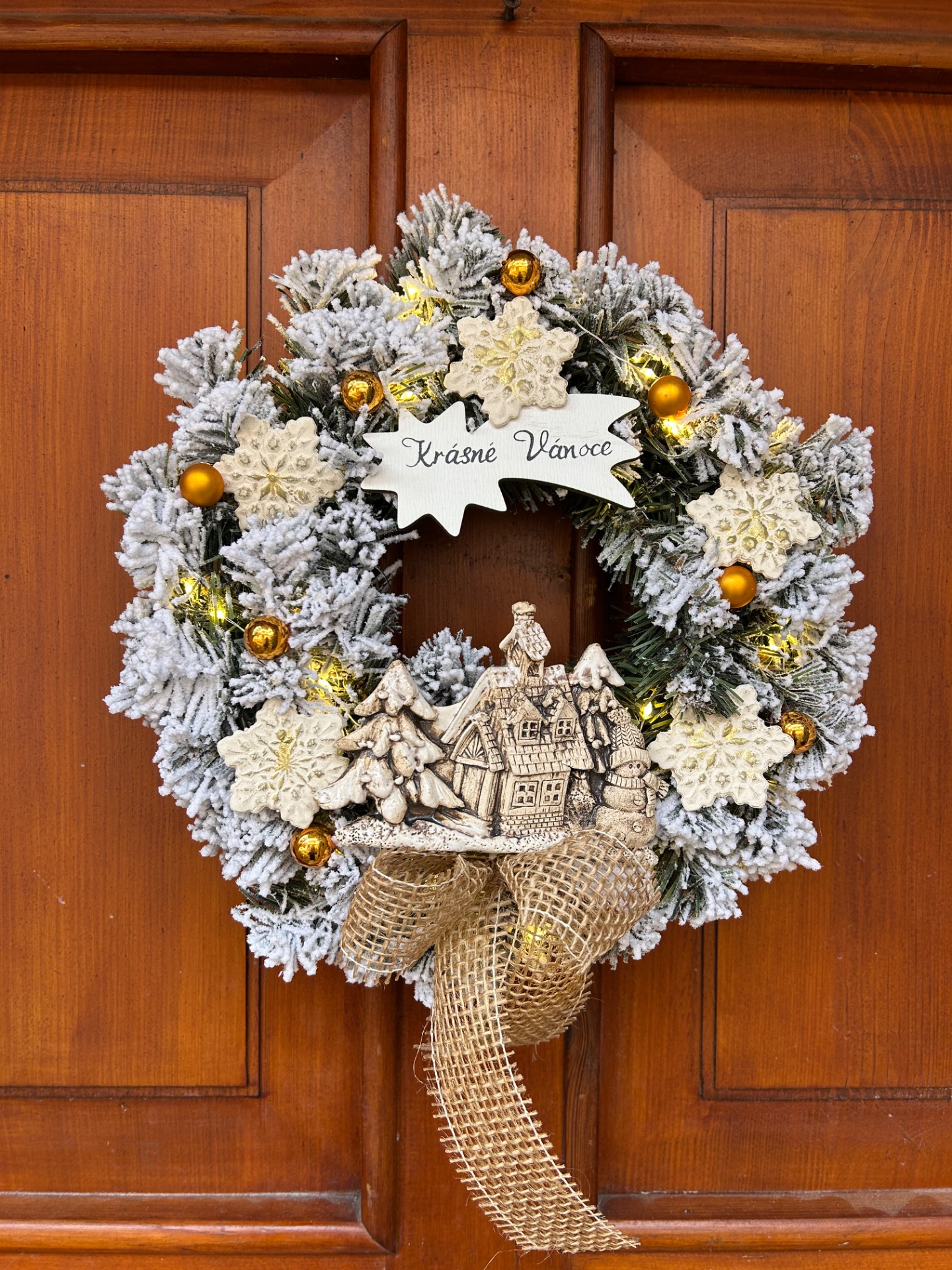 Vánoční zasněžený věnec zdobený do zlato měděný barvy