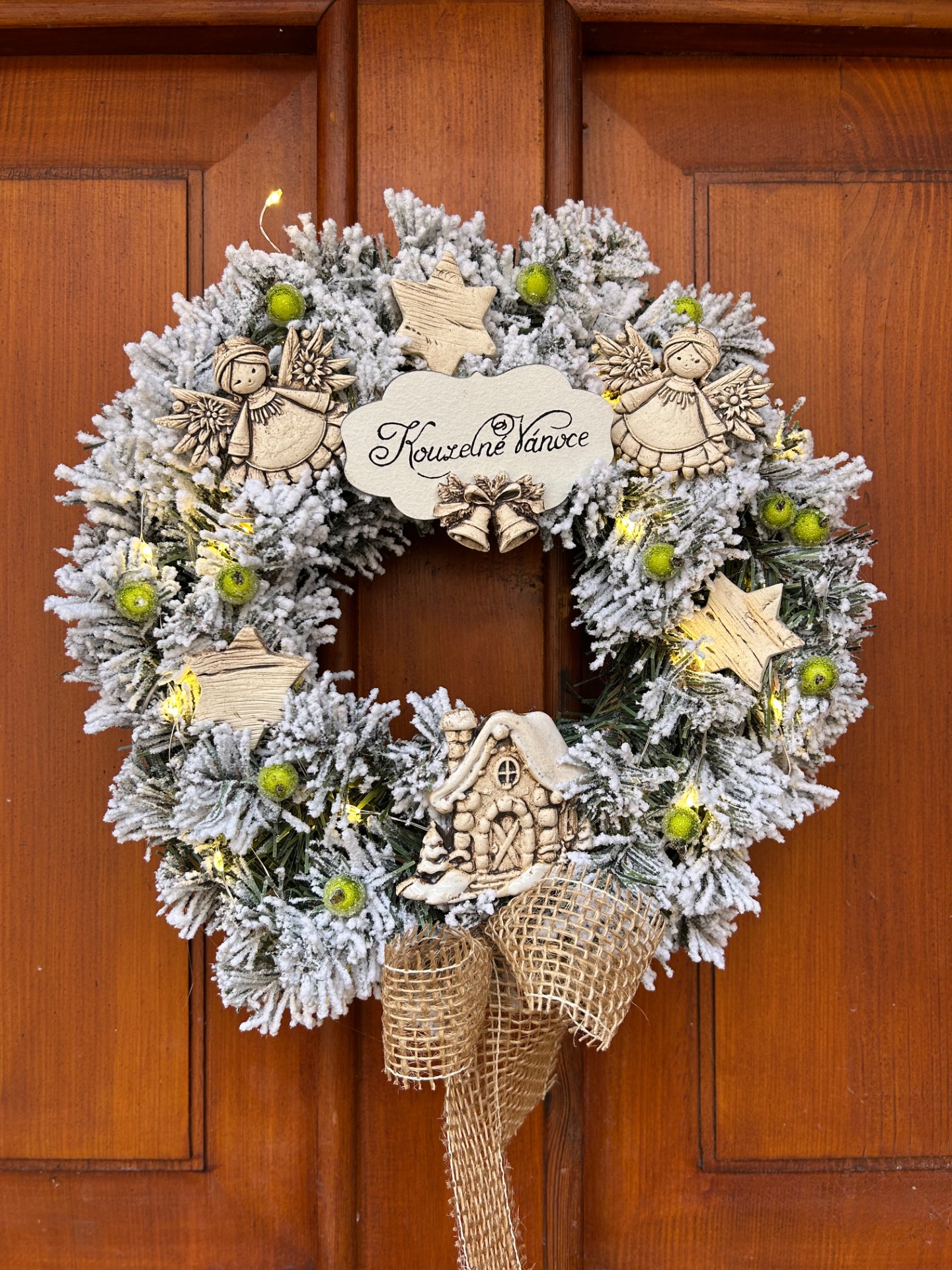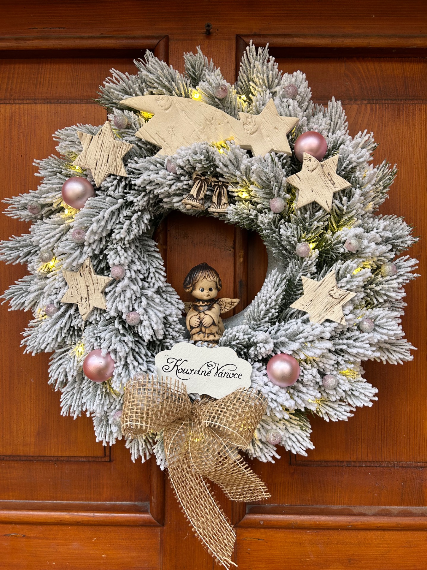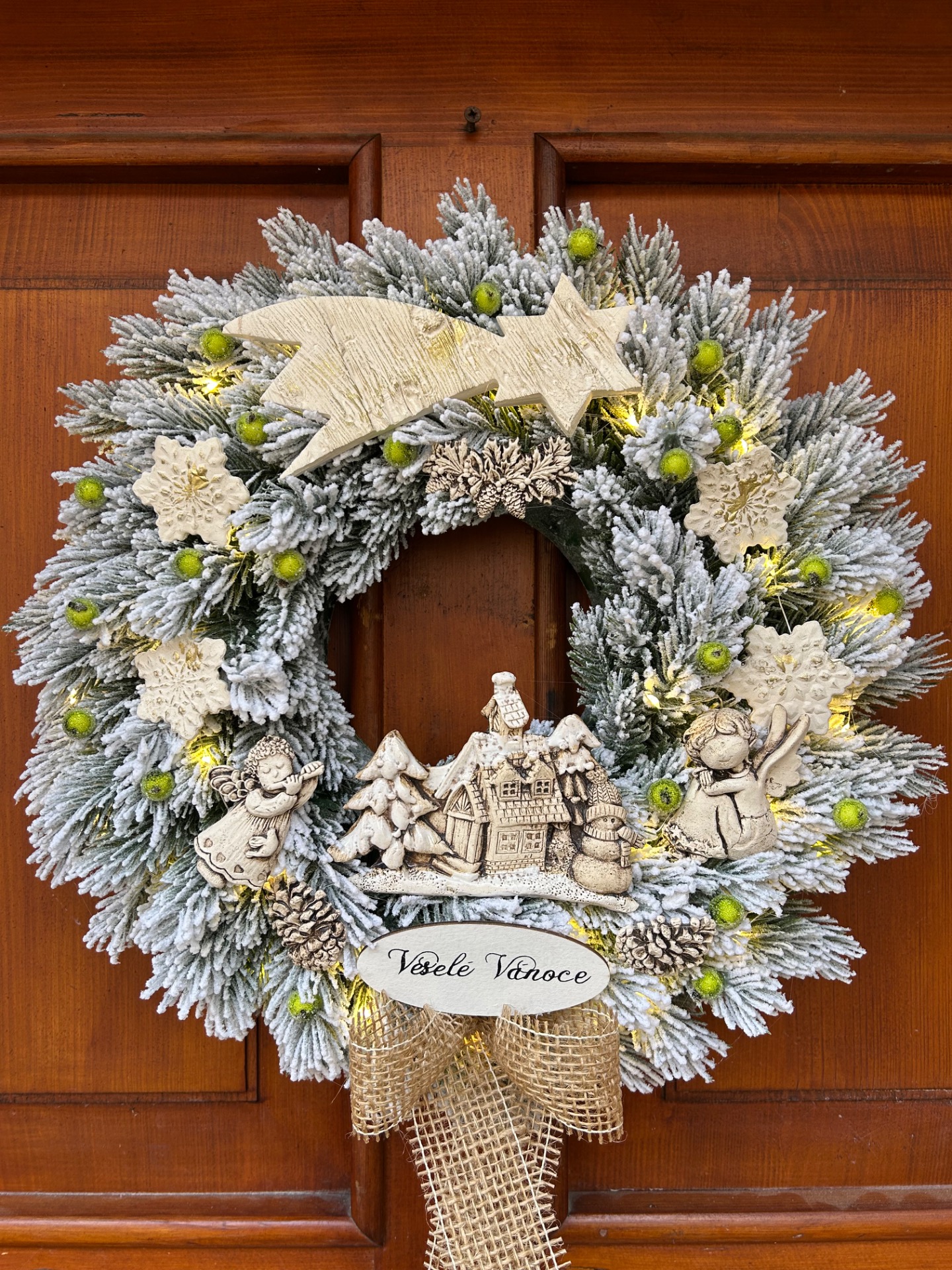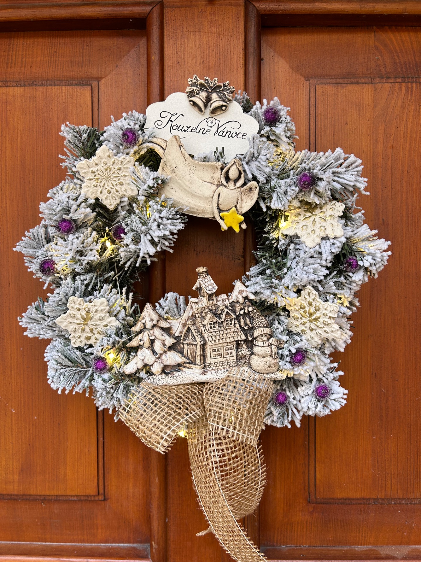 Vánoční zasněžený věnec zdobený do zlato měděný barvy