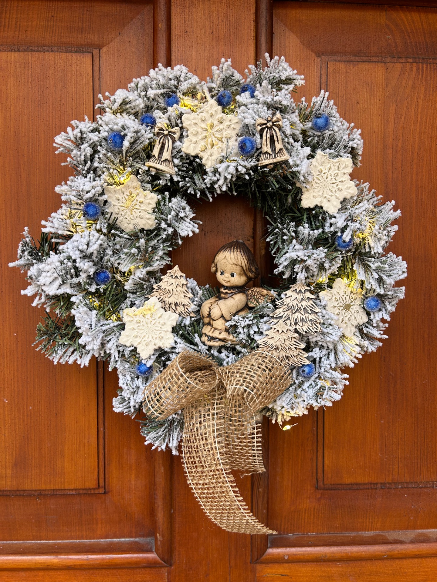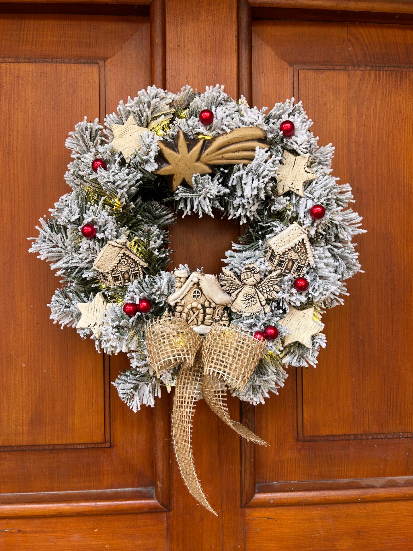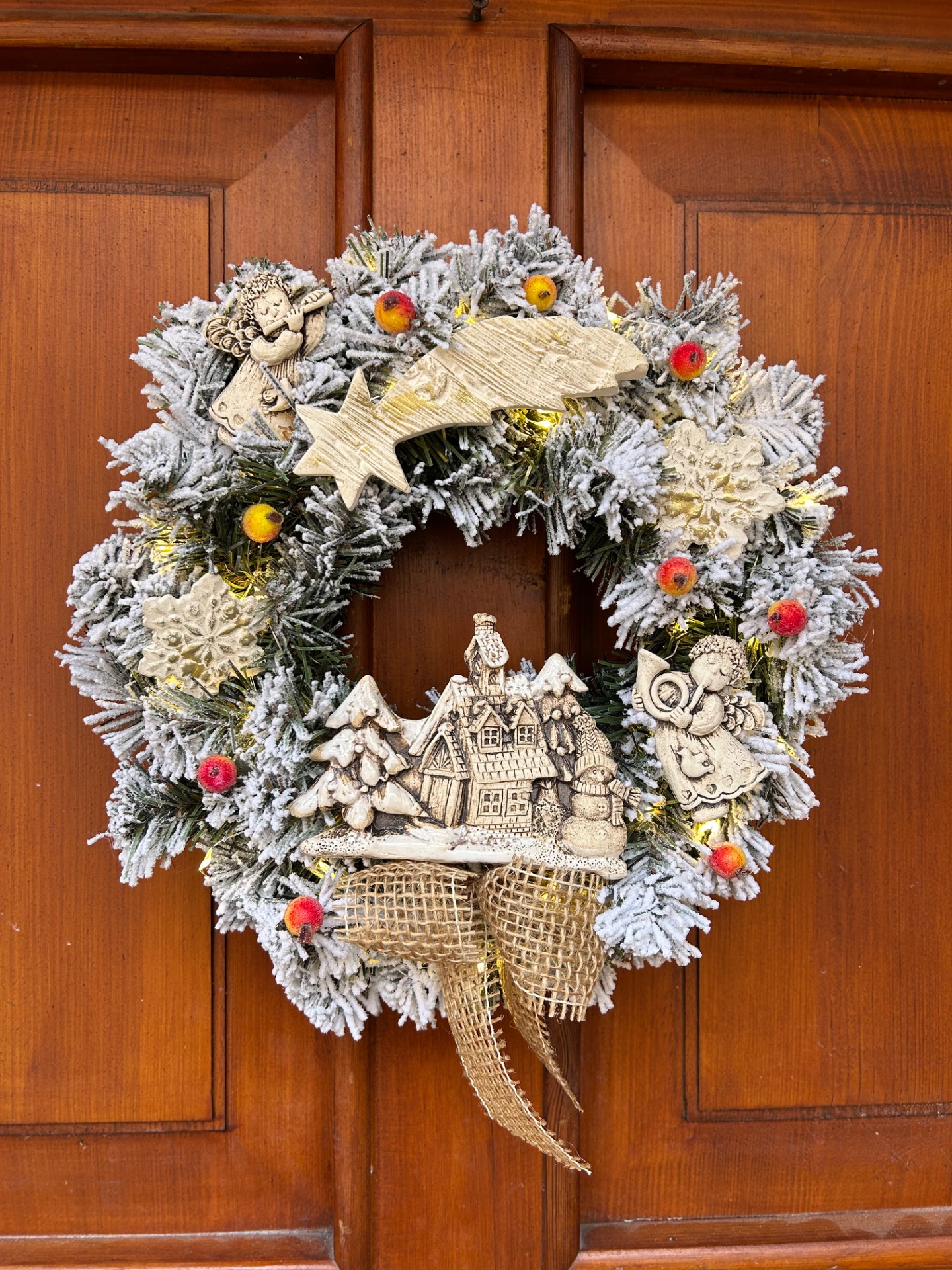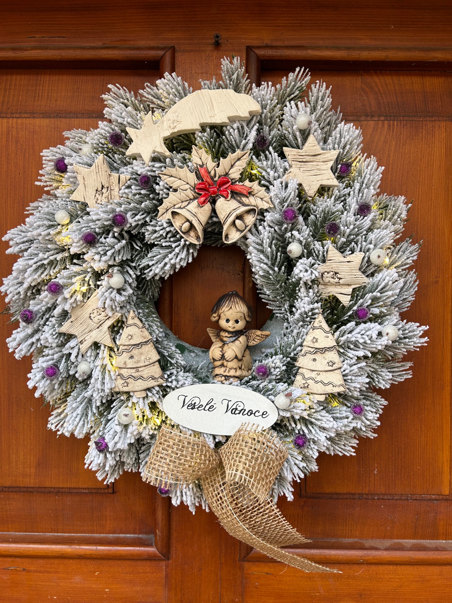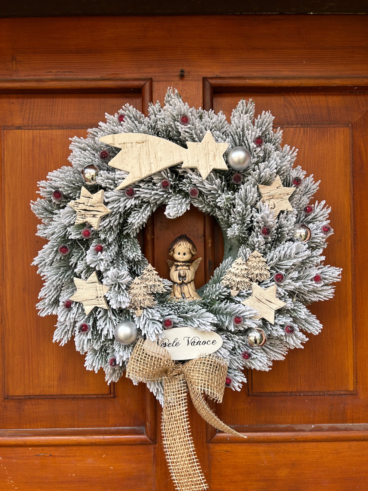 Vánoční zasněžený věnec zdobený do zlato měděný barvy